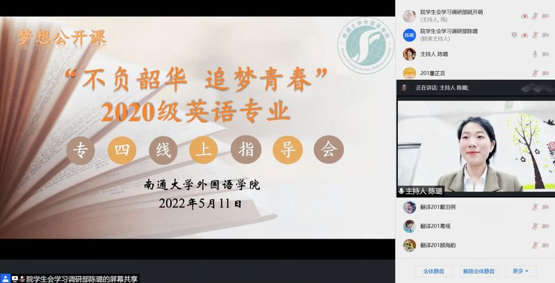 5月11日下午,永利总站ylzz55举办了“不负韶华 追梦青春”2020级专四考试线上指导会,年级辅导员、班主任及全体2020级本科生参与了本次活动。