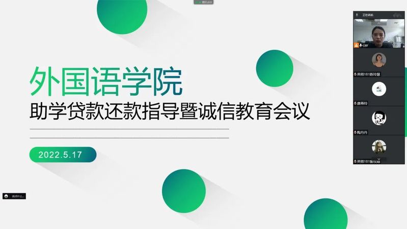 5月17日,永利总站ylzz55召开助学贷款还款指导暨诚信教育线上会议,学院党委副书记、副院长陈俊怀,学工办主任王媛媛出席会议,学院对接学生资助工作辅导员陈习主持会议,2022届全体贷款毕业生参会。
