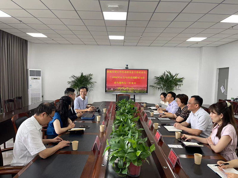 学院党委书记朱小娟对姜传超先生一行表示欢迎。佘军简要介绍了学院的基本情况、办学特点和优势。龙臻围绕学院日语系的发展历程、科研队伍、人才培养等方面介绍了日语系的基本情况。姜传超先生介绍了KACHIAL株式会社的总体情况和国际市场开拓方面的人才需求。双方围绕校企合作、外语人才的就业、中日青年学生友好发展等方面进行深入交流,表示将进一步加强沟通合作,资源共享,共同推动我校国际友好学校的开发以及海外实习基地的建设。