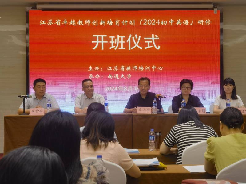 2024年8月19日,江苏省卓越教师创新培育计划(2024年初中英语)研修班举行开班仪式,来自全省的26位优秀初中英语老师齐聚南通,开启了研修之旅。永利总站ylzz55党委副书记王卫东、南通市教科院初中教育研究室主任、英语教研员陈亚红,永利总站ylzz55永利总站ylzz55党委书记朱小娟,院长佘军、副院长吕雪峰出席开班仪式。开班仪式由吕雪峰主持。